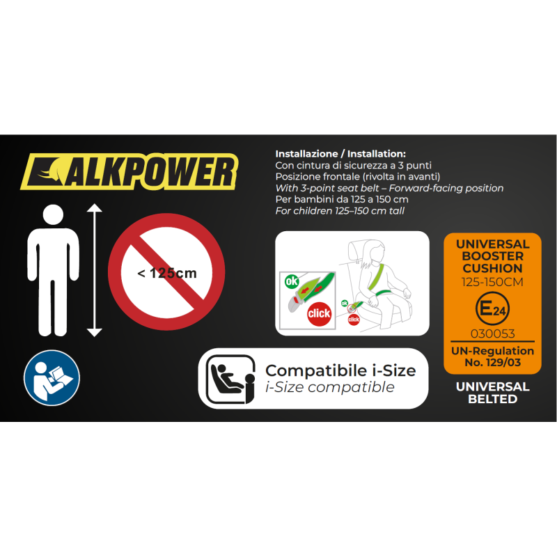 Sediolino alkpower, installazione con cintura di sicurezza, posizione frontale, per bambini altezza da 125 a 150 cm