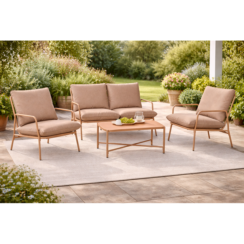 Il set salotto da giardino 4 posti è la soluzione ideale per creare un’area relax elegante e contemporanea in giardino, terrazzo o veranda. Il design moderno, con struttura in acciaio rosa, lo rende perfetto per ambienti outdoor raffinati. Composto da divano a 2 posti, 2 poltrone e tavolino coordinato, questo set unisce comfort, stabilità e stile minimal, adattandosi facilmente a diversi contesti abitativi. La struttura in acciaio verniciato garantisce resistenza e durata nel tempo, mentre i cuscini imbottiti in poliestere offrono una seduta comoda e accogliente. Il tavolino con piano in metallo completa il set, ideale per momenti di relax all’aperto.