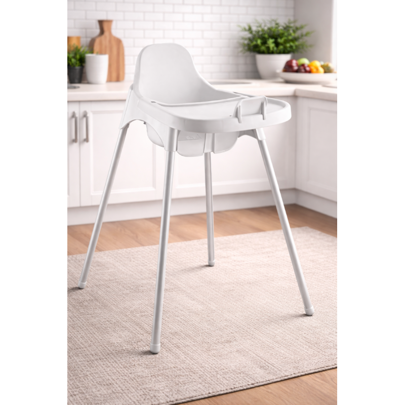 Sediolone pappa, colore bianco, materiale plastica, gambe in metallo, con piedini antiscivolo, età 6/36 mesi, peso massimo 15kg