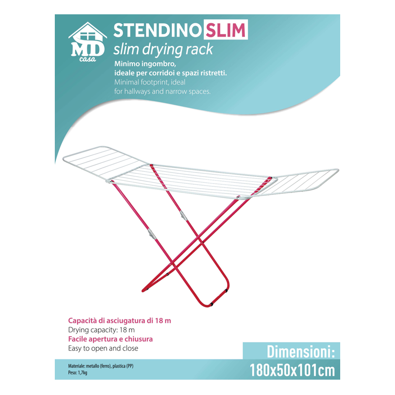 Stendino slim, facile apertura e chiusura, materiale metallo ferro e plastica, dimensioni prodotto 180x50x101 cm, minimo ingombro per spazi stretti.